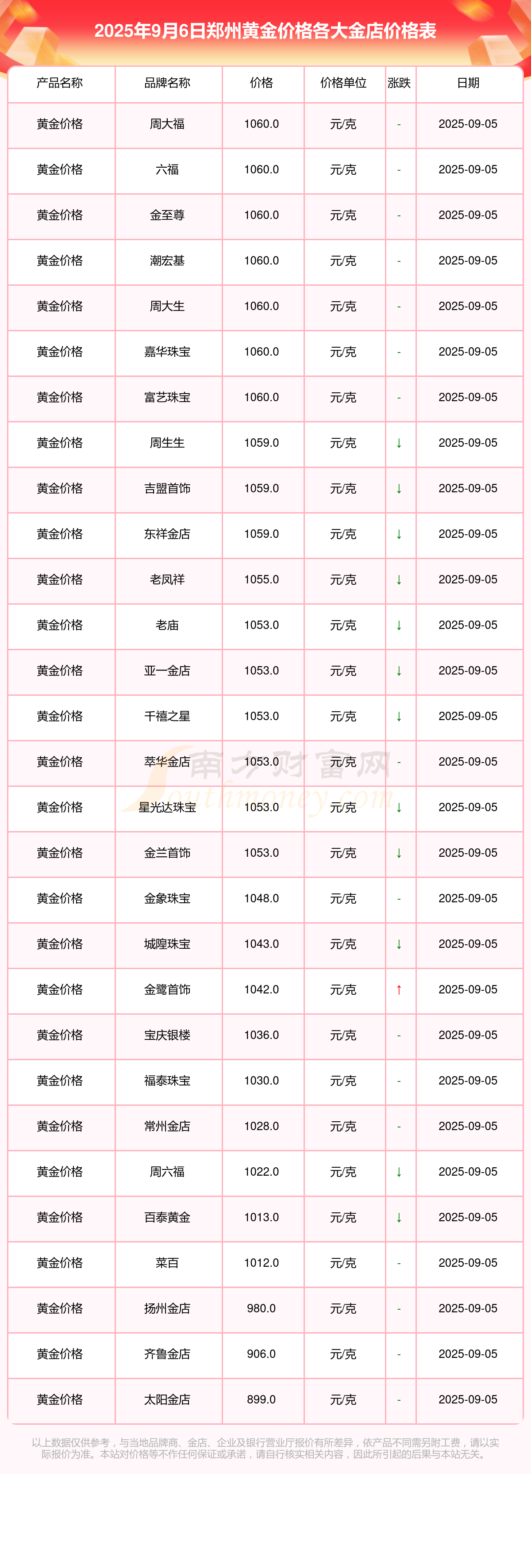 目前,郑州黄金价格最高的金店为周大福,报价1060.0元/克。而黄金价格最低的金店是太阳金店,报价899.0元/克。今日黄金价格高低差为161元/克。